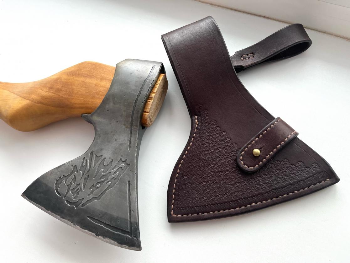 Продам топор ручной работы. Голова 1967 года, травление, воронение. Топорище резное из комеля берёзы. Чехол из итальянской кожи с теснением. Цена 15000 р. Телефон: 89171298471
