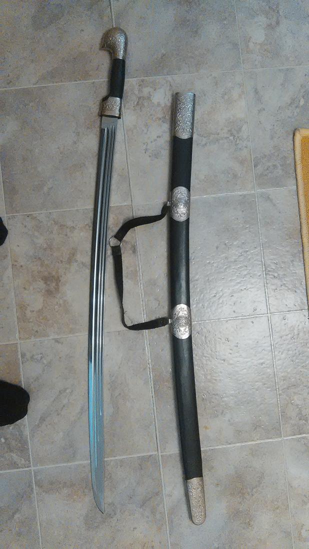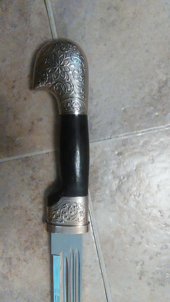 Продается шашка "ТКВ-1". Полная длина:1015 мм. Длина клинка:845 мм. Клинок: коррозионно-стойкая сталь. Был куплен в Дагестане в июне 2015 года. Имеется гарантийный талон и печать магазина. Цена 15000 рублей. Продает товарищ. Телефон: 89371812738