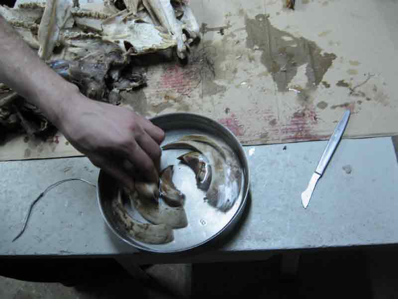 - Заливаем, чтобы клыки не торчали из воды и желательно не касались края емкости. - Как закипело, (время разное, от обьема воды). Засекаем время примерно 40-60 мин. - Снимаем емкость с огня и ждем пока остынет, работаем с теплым раствором. - Верхние обычно вытаскиваются без усилий (не считаем аномальные клыки) Закрепляем нижнюю челюсть, оборачиваем тряткой и давим, потом тянем – раскачиваем клык. Эти два комплекта не большие и вышли без труда, но крупные клыки на 70% в челюсти и радиус клыков, часто, не совпадает с местом выхода из челюсти – придется обрубить !! Делать это нужно деликатно, чтобы не повредить клык. Фото 1-2-3, показано место которого обычно достаточно, чтобы клык вышел. Обрубать лучше маленькой стамеской или заточенной плоской отверткой. |
