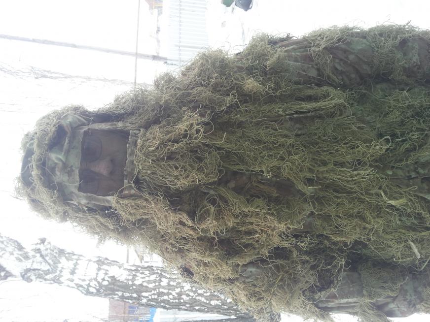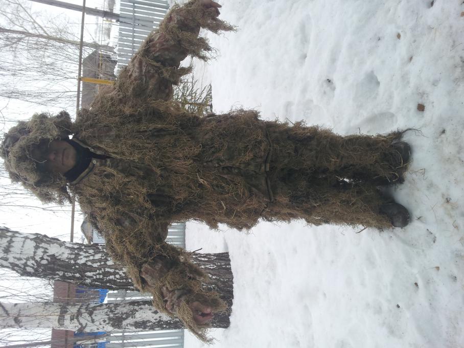 Второй сделан из натурального лыка, нашит на непромокаемую куртку с капюшоном.Место применения- поле сжатой пшеницы или камыш. Цена 3000руб.