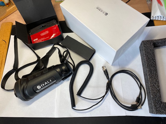 Состояние нового. На охоте был два раза. Монокулярный тепловизор Dali S240-19 предназначен для использования охотниками - прибор с дальностью видения до 550 метров позволяет обнаружить цель и вести наблюдение за перемещением без запаздывания изображения на LED -экране разрешением 640х480. Линза 19, нет wifi, нет записи, дальность обнаружения 550 м, дальность идентификации 200 м.)