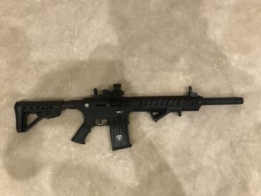 Газоотводный полуавтомат 12 калибира с регулируемым прикладом, общая длина составляет 1020 мм и сложенным прикладом 950 мм. Изготовлен на базе штурмовой винтовки М-16. Продажа через ЛРОО. Цена 35000 ₽ т. 89033083106 Алексей. Калибр 12х76 Длина ствола 470 мм Общая длина 1020/950 мм Масса 3.6 кг без магазина Прицельные приспособления Диоптрический кольцевого типа и V-образный Магазин 2,5,10- местный Алюминиевый сплав 7075 Производитель Турция |