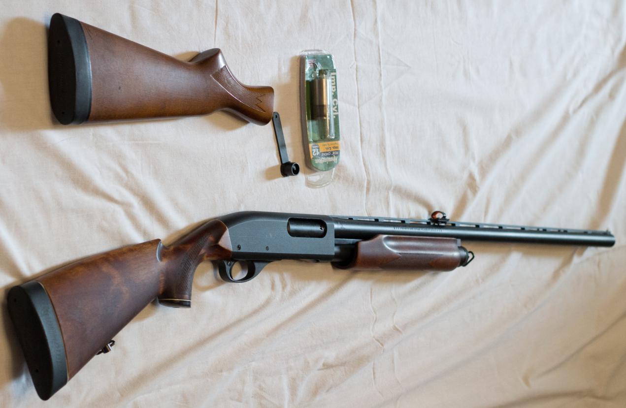 В комплекте: сам Рем с индивидуальным прикладом, родной приклад, 2 дульных сужения, чоковый ключ, светонакопительная мушка (надо приклеить на место), мушка dead ringer