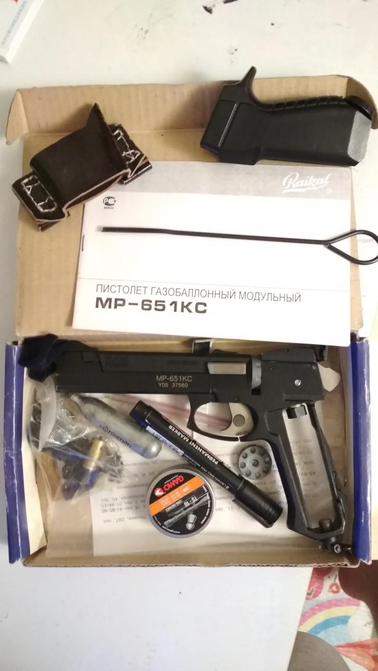 В комплекте паспорт, коробка, два клапана(на большой и маленький баллоны), кобура на пояс самодельная, четыре барабанчика (металл+пластик) под разные пули, баллон для заправки газом для зажигалок. Где-то лежат ещё приклад и цевьё, но сейчас не найду.