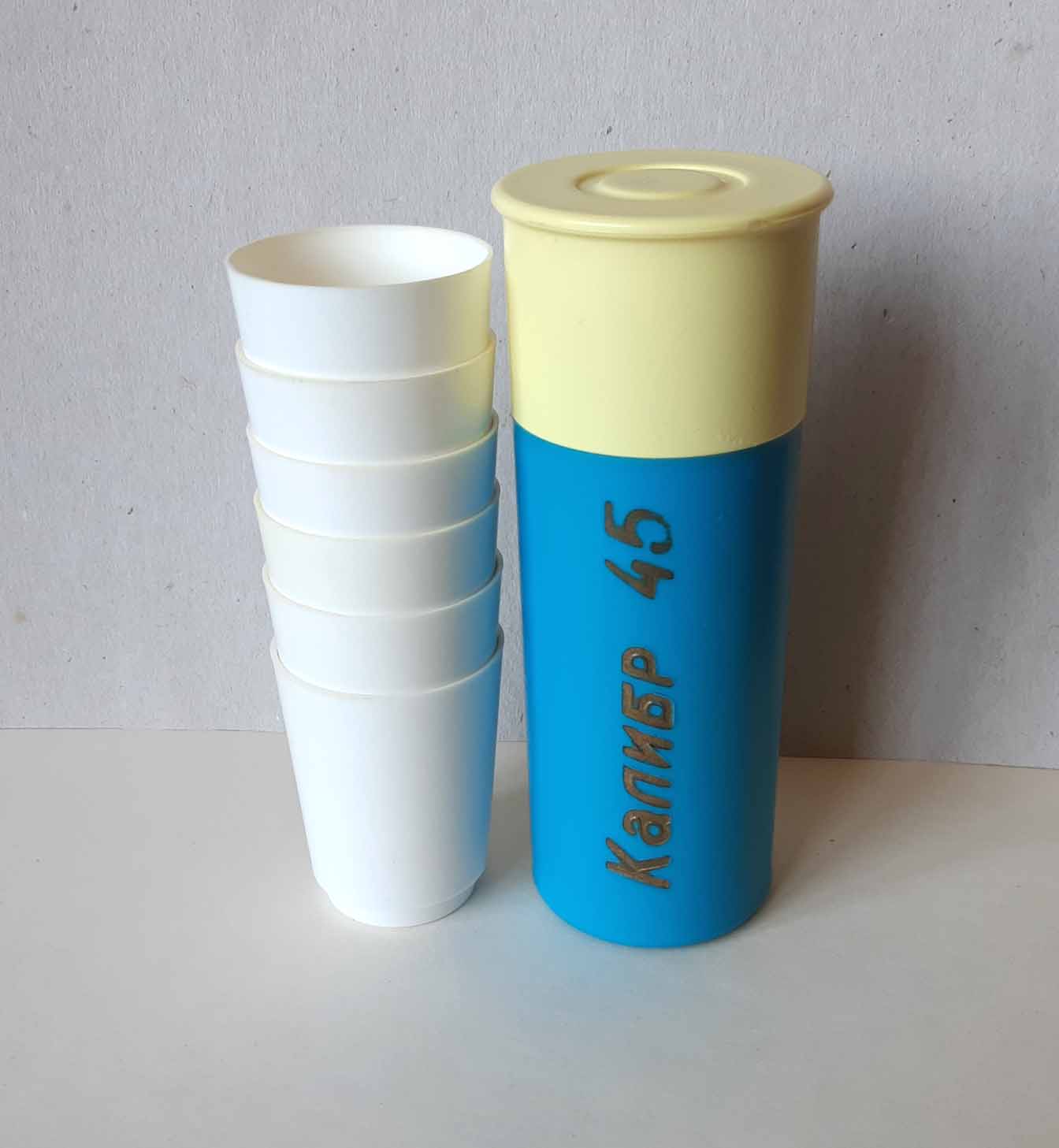 Продаю набор стопок "Калибр 45", времен СССР, пластмасса. Обратите внимание, что сам пенал сделан в форме охотничьего патрона! Состояние очень хорошее, пользовались буквально пару раз. Длина пенала 12,5 см; высота стопки 5 см; емкость 40 мл. Я живу в Москве, почта на покупателе. Все вопросы в личку или лучше мне на почту: kogoleg@yandex.ru Цена 2500 руб.