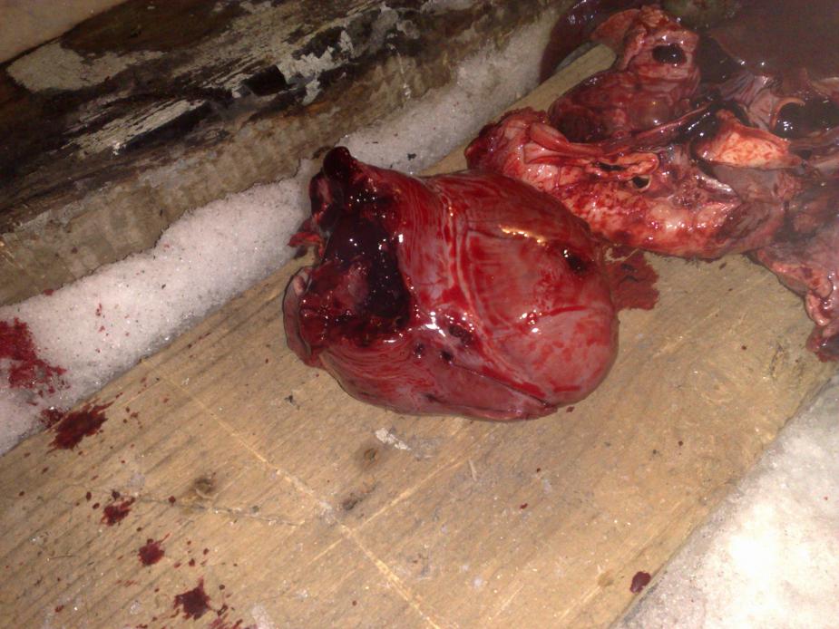 Я Элитом кабасика бил, картечью 8,5мм! Падает одинаково, что от Клевера, что от Позиса, что от Сафари... Главное попасть куда надо. Пробивают хуже чем Клевер однозначно. Клевером стрелял с 30-40 метров с вышки под углом за лопатку. Смотрите что случилось с сердцем... Вышли все картечины через грудь в снег... Дырочки аккуратные и мясо сильно не попортилось.