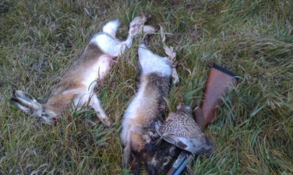 ...сегодня порадовали угодья Краснояского р-на, до обеда прошарили все- ноль, только козу одну видали, но она в угодья "папы Леши" ушла ( знает- там не тронут)))...и только далеко за обед нашли чудный бурьян который наградил нас парой зайчиков и куропаткой...извините за их внешний вид- один на веревке ехал до машины "мордой в грязь"))