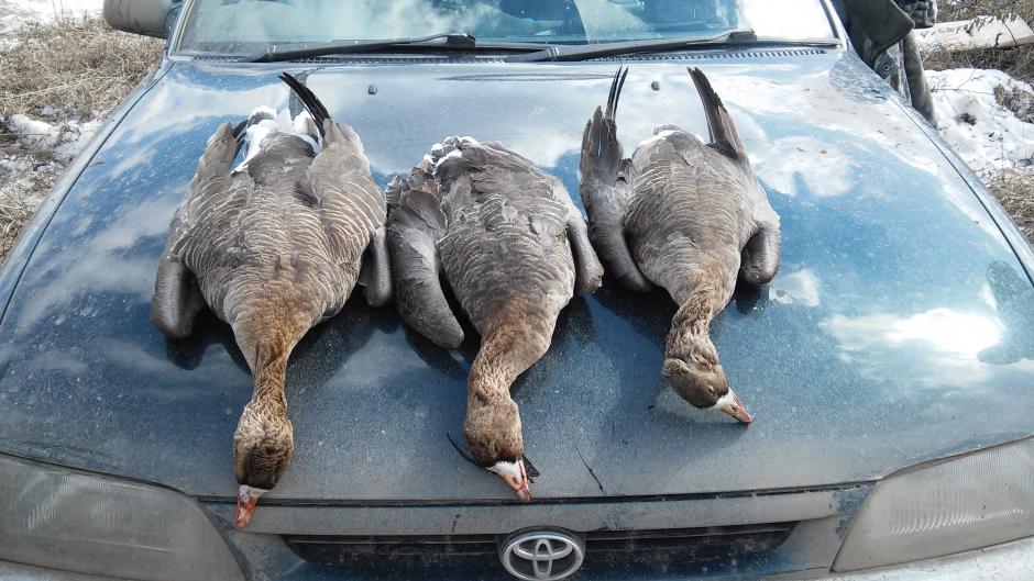 Ну что ж, напишу и я небольшой отчётик по открытию. Ездить искать гусика начали ещё за неделю, нашли, много… Приехали в пятницу, разбили лагерь, для тех кто хотел поохотить утку - нашли озерцо, которое уже вскрылось и небольшие разливы, бросили чучела определили места где спрятаться можно. А сами смотрим где над полями идет основной пролет. Определили где коридор и в ночь уехали копать. Нашли в темноте котел, ор гусинный стоит аж в ушах закладывает. Не доезжая до предполагаемого котла где то 700 – 800 м, приняли окапываться на перепаханном поле, как раз на трассе гуся. Ну кто копал тот поймет, какая это нелегкая задача, по ночи месить чернозем. Нас было трое, выкопали 3 окопа, как смогли замаскировали землю. Выставили чучела. Все подготовили, поехали в лагерь. Поспали 1,5 часа и в путь. Так получилось что доехал до места я один, мой напарник уехал дальше в посадку, причины не важны, важно следствие… Гуся было море, тыщи и тыщи, направление мы угадали и место тоже, шли и высоко и низко, ноооооо не долетая 200 – 300 м уходили в высь…. Посмотрев со стороны стало понятно что пугает… маскировка, с большой буквы М была никакая, кучи черной земли, все вокруг вытоптано, не закрытые 2 свободных окопа, короче говоря утрянка была потеряна…. Вернувшись в лагерь, немного смазав разочарование, обсудив недочеты, приняли решение потратить больше времени и качественно подойти к маскировке. Поехав на место ночной «стройки», и хорошенько осмотревшись, в километре нашли поле скошенной кукурузы и подсолнуха. Начали копать, взяли мешки и вывозили землю, долго, скрупулезно, но мы это сделали. Подготовили из сетки накидки, замаскировали их скошенными стеблями кукурузы. Расставили чучела по специальной методе, которую где-то вычитали. Вернулись в лагерь где-то часа в 4 дня, быстро поели, перебрали патроны и в бой, на подъезде к нашим окопам из далека уже было видно что ОН там, стайки кружились, кто то присаживался…. Ляпотаааа. Сели и начали манить, но гуся на вечерке было очень мало по сравнению с тем что творилось утром. Но он был, первые же налеты показали что с маскировкой все гуд, гусь подвоха не чувствует и налетает отлично. За вечерку взяли одного и было много досадных промахов, в след раз нужно ставить в стволы цилиндры и брать патроны без контейнера, на коротке самое то будет, ну и конечно практика и тренировка стрельбы.