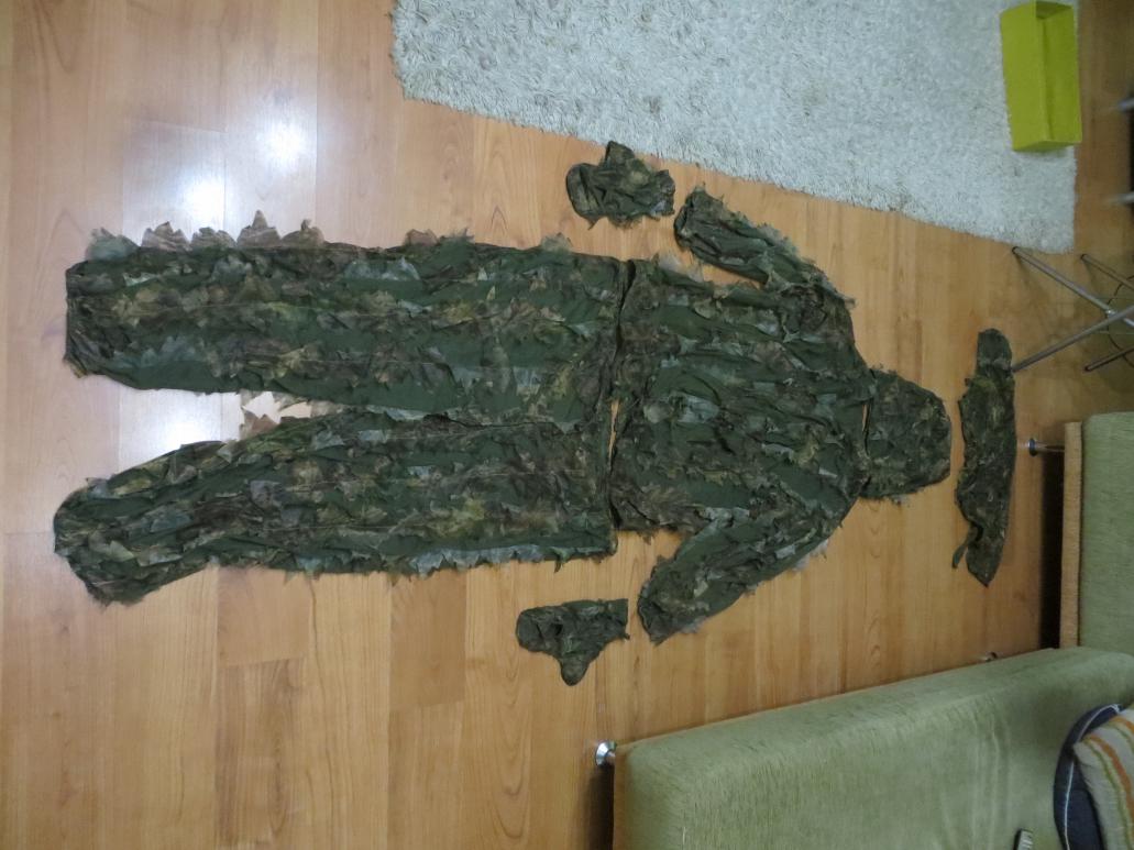 По маскировочному костюму: маскировка на очень мелкой сетке. В комплекте штаны, куртка (на молнии с утягивающимся низом), рукавицы, балаклава, бандана хитрой конструкции ( с "аоротником" полностью закрывающим спереди и сзади шею). Вес всего комплекта 700 гр. Размер - рассчитан поверх теплой одежды, мал не будет ). РосХантер. Цена 3 000.