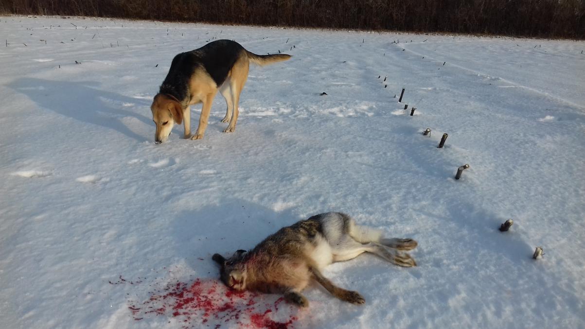 Но результат есть. Расписывать долго не буду. Первый лежал в посадке. Я стоял на номере в прогале, а он лежал за спиной метрах в 20-30. Уж когда пошли к машине, поднялся и на другую сторону выскочил на брата. Второго поднял выжлец в подсолнухе. Послушали гон минут 10. Даже не видели. Третьего товарищ поднял в пашне. Подранок. Ушел за ним, следом выжловка привязалась. Пока он шел вдоль посадки, поднял еще одного. Говорит, здоровый, даже испугался. ![]() Минут через 20 слышу два выстрела, потом еще два. Потом гон. Смотрю по полю (метров за 700-800 примерно) две точки. Собака дистанцию держит: 20-30 метров и не отстает. Косой то вправо , то влево. В итоге прошел от меня в 15-ти метрах. Был добран.