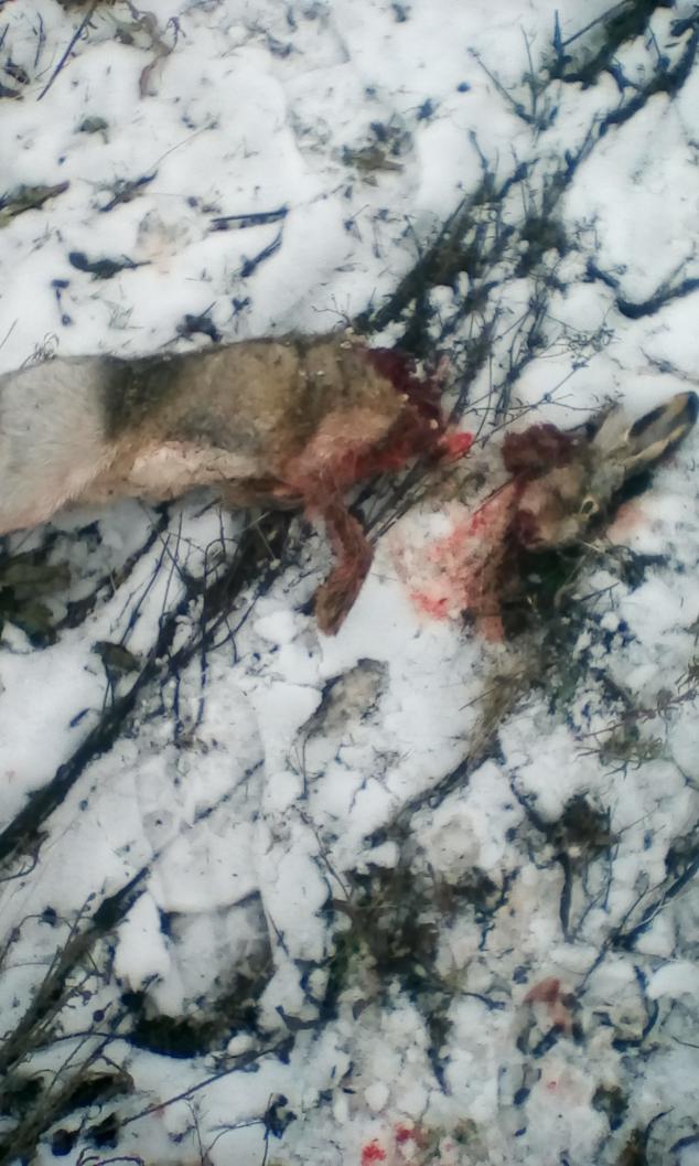 разу в другой угол.есть свежая жировка.в поле прекрасно все видно.вышел на дорогу, пробежал немного, двойка-скидка и в кусты.раз 10 проходил.нет подъёма.весь овраг истоптал и вверх и вниз.в траве снега нет. Обошел кругом овраг по полю и дороге. Нет выхода.вернулся. пошёл к заходному. Нет ничего.и тут вижу по своему следу вдоль дороги гонный. Свежак. Поднялся незаметно..прошёл с 500м по дороге,двойка и снова в кусты в овраг.спустился.несколько ветел в овраге.подхожу к ним.непролазные кусты. И тут вылетает.метров 20.бью через траву тройкой.прыжок и пропал в кустах.думаю не попал. Подхожу ближе выскакивает. Как то вяло. Добавляю вторым падает правое ухо.вижу что хороший подранок. Вообщем полтора часа скитаний за ним по чащобам,снег стремительно тает. Иду и ищу чисто по крови.делаю большой круг след в тропу в посадку, дальше в поле,прошёл метров 100. И вижу картину как метров в 100 от меня лиса тащит зайца! Су....ка ... Понимаю что это мой подранок. Только нашла она его раньше. Короче без головы ушан остался. Отгрызла. Видимо поймала на лежке. Пришлось передок отрезать почти весь.дробь пробила лёгкое и переднюю правую лапу. Фото позже.счёт открыл. Пусть и с перчинкой