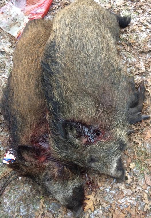 А тем временем мы провели очередную загонную охоту в Самарской области. Три шикарных загона и не менее шикарных трофея: секач и два подсвинка. Стрельба велась с Тигра (7,62х54) и ИЖа 27. Отличная работа собак и стрелков. Секача добирали вместе, поэтому на фото и мой карабин)))).