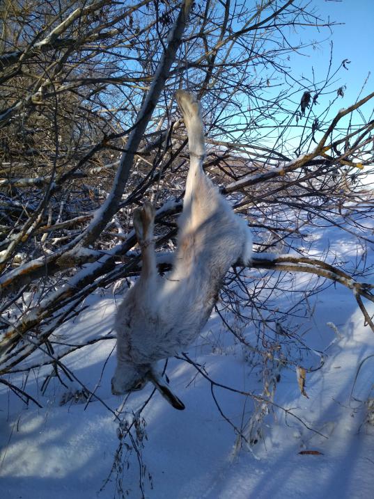 Было всего два подъема и обоих поднял брат. По первому промазал. На второго наткнулся, когда шел за выжловкой. Ушла через поле в дол. Видимо за козой. А я в это время шел за выжлецом. Он точно ушел за козой. Пока искал выжлеца, заметил лису на пашне, а за ней следом (метров в ста) еще одна. Немного попробовал подстроиться, но снег скрипит ужасно. Смотрю одна идет в мою сторону и проходит в метрах 50. Хотел, честно говоря, сразу двух отсанитарить. Но вторую не вижу. Принимаю решение стрелять, но лис повернулся задом. Не удобно, держу на мушке, замечаю вторую, которая должна выйти еще ближе. Появилась в метрах 30-ти. Выстрел, кувырок, прыжок, выстрел, побежала, метров через 40 упала. А первая отбежала и смотрит в мою сторону, потом по радиусу 150-200 м обходила меня и тявкала (на фото светлое пятно). Выжлеца нашли. Лапы сбиты. Две недели теперь больничного у них. А вот и зайка. 6.01.18 поехали вдвоем без собак. Цель минимум - 1 косой. Вышли на тоже поле. Там есть не паханый пятак с травкой и деревцами. Позавчера там тоже проходили. Но пробуем опять. Косой все-таки залег там. Слышу Подъем! Смотрю летит зай, выстрел, готов. Брат опять отличился. Сколько потом не прочесывали подсолнух- ни кого больше не подняли. Хоть жирок новогодний растряс, воздухом надышались!