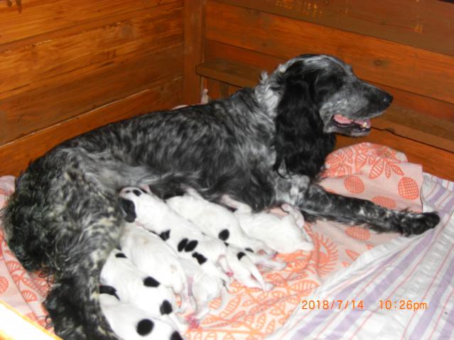 8 щенков: 5 кобелей (4 черно пегих, 1 рыже пегий) / 3 суки (2 черно-пегие, 1 рыже пегая).