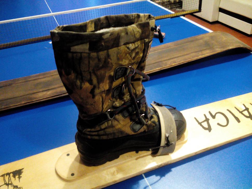попробуй пришпандорить покрышку от велосипеда под стопу, прикрепив дюралевыми уголочками. Норм получается и снег не набивается.