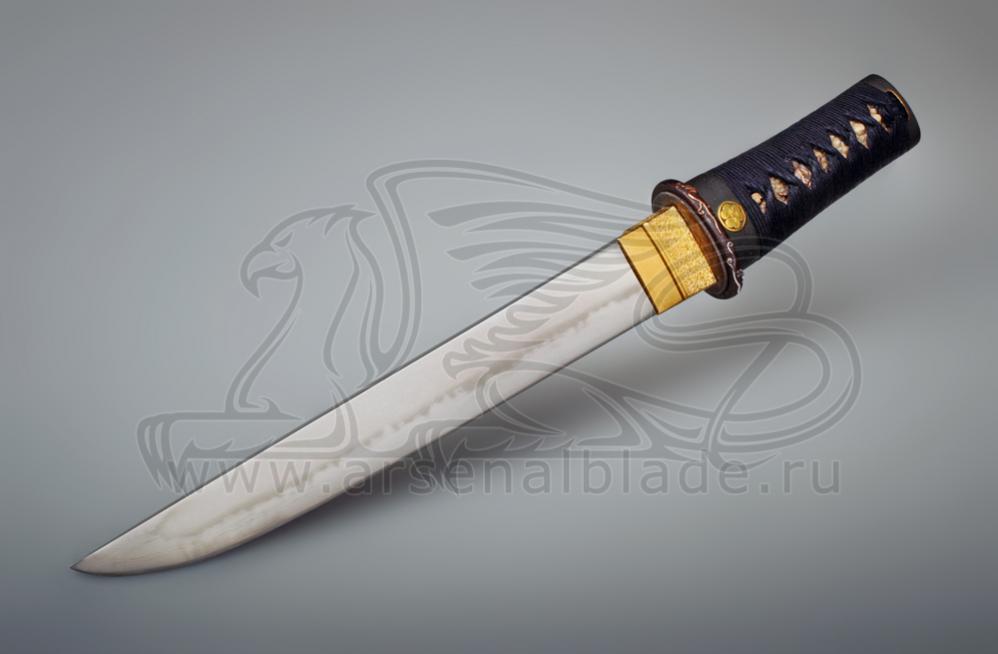 Нож вобрал в себе и что то от исторического прототипа, и что то от классического ножа в стиле танто. Не того «псевдо танто», которое культивируют и навязывают западные ножевые фирмы, который и близко не соответствует форме настоящего японского танто, имея вид скошенной стамески, – а именно классического. Нарочитая грубая отделка клинка, со следами ковки, деревянная буковая рукоятка удивительно приятная и удобная в руке. Монтаж клинка в рукоять всадного типа на клею. Деревянные ножны и оригинальное кожаное крепление в них клинка и подвеса на пояс. Один раз увидев этот нож, его уже не спутаешь ни с каким другим. Сталь клинка тройная ламинированная. Центральная режущая пластина клинка изготовлена из порошковой быстрорежущей стали SKD 11, а боковые пластины – из нержавеющей SUS 405. Твёрдость «режущей» стали – 63 HRC. При его изготовление мастера старались максимально выдержать технологию изготовления той эпохи.
