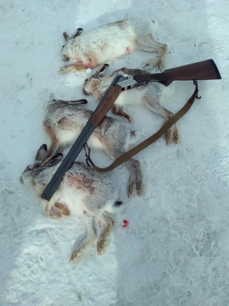 Заяц встал не видимым, ушёл через железную дорогу. Там выясняем в какую посадку ушёл, обходим посадку, с другой стороны на номере (молодой). Только хотим начать чесать посадку, заяц бежит по полю, прятялся на краю посадки. Разделились, один по следу, второй по посадке. В посадке встаёт заяц и выходит на номер! Один первый выстрел молодого охотника и заяц взят. Ну а я дальше тропить, сбился со следа, опять нашёл, долго ходил, скорее всего потерял след поднятого зайца и пошёл в посадку. След заходной в посадку был. Встал на номер, посадка очень широкая, выбрал препологаемое место прохода зайца, жду. Заяц вышел не там где я стоял, но посмотрел, как он сел огляделся и стартанул. Прошли всю посадку, думаю подняли ещё одного, но не видели, определили по следам. На конце посадки расставились, тропим, до поля осталось несколько деревьев, выстрелы.... И заяц благополучно ушёл)))) там была ошибка старшего товарища, но это мелочи) долгая дорога к машинам, обед и приятный гул в ногах. Мы закрылись! Ждём нового сезона! |