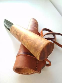 Еще фото. Точные размеры сейчас не скажу. Если кому интересно, буду уточнять. Рукоять под широкую руку. Где-то 120мм. Клинок что-то 100мм с небольшим. Толщина клинка переменная, у самой рукояти в обухе 4мм. Клинок заказывал на ножевой барахолке ВК у кузнеца из Ростовской обл. за 1500. Делал регринд, убирал пузо. Брусок карелки на ярмарке мастеров 700. Кап ели друг спилил в костромском лесу на сплаве, вырезал из него чашу, а брусок отдал мне. Кожу брал у мастера в тлт не за дорого. Средство для воронения в Охотомании. Пропитка тоже чего-то там. Ну ещё клей эпоксидный, цианакриловый и Don Deal. Вот и все ценообразование. Остальное ручки )). Собрал ради интереса. Строгает супер, режет, бреет даже. Может есть левша, которому надоело подковывать блох и проще купить, чем самому пилить-точить...