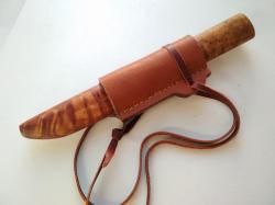 Еще фото. Точные размеры сейчас не скажу. Если кому интересно, буду уточнять. Рукоять под широкую руку. Где-то 120мм. Клинок что-то 100мм с небольшим. Толщина клинка переменная, у самой рукояти в обухе 4мм. Клинок заказывал на ножевой барахолке ВК у кузнеца из Ростовской обл. за 1500. Делал регринд, убирал пузо. Брусок карелки на ярмарке мастеров 700. Кап ели друг спилил в костромском лесу на сплаве, вырезал из него чашу, а брусок отдал мне. Кожу брал у мастера в тлт не за дорого. Средство для воронения в Охотомании. Пропитка тоже чего-то там. Ну ещё клей эпоксидный, цианакриловый и Don Deal. Вот и все ценообразование. Остальное ручки )). Собрал ради интереса. Строгает супер, режет, бреет даже. Может есть левша, которому надоело подковывать блох и проще купить, чем самому пилить-точить...