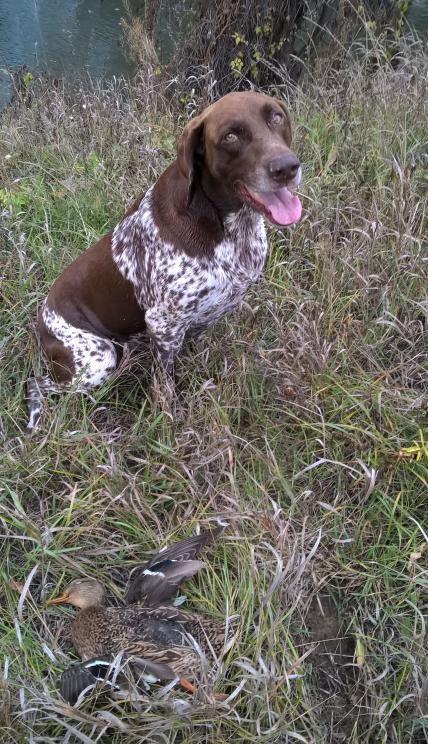 Давно не ходил на уток,но пёс упросил - вчера пошли.На результат я особо не рассчитывал,уж больно много народу ходит вдоль речки. Подходим-смотрю Нива ездит вдоль берега,приблизительно через каждые 30 метров останавливается и двое с ружьями выходят проверять наличие уток поблизости.И так дальше.Ну пришли так пришли-надо охотиться.Я иду по берегу сверху пёс прочёсывает берег внизу,идёт во воде.С километр прошли,я задумался.смотрю-собаки нет. Возвращаюсь назад и вижу-он стоит в стойке и не отрываясь смотрит на пучок травы в воде метрах в пяти от него.Гляжу туда-ну нет никого.Зашёл с другой стороны-тоже ничего не вижу.Пёс не уходит,его начинает колбасить.И вдруг из этой травы медленно взлетают две кряквы,отпускаю подальше чтобы не разбить дробью-стреляю в одну.В другую стрелять не стал.Зачем?Утка падает на воду в 25 метров,пёс плывёт,тащит её мне на берег.Его радости нет предела!Дальше не пошли-поехали проверить насчет вальдшнепа,пёс у меня всё никак не может успокоиться.