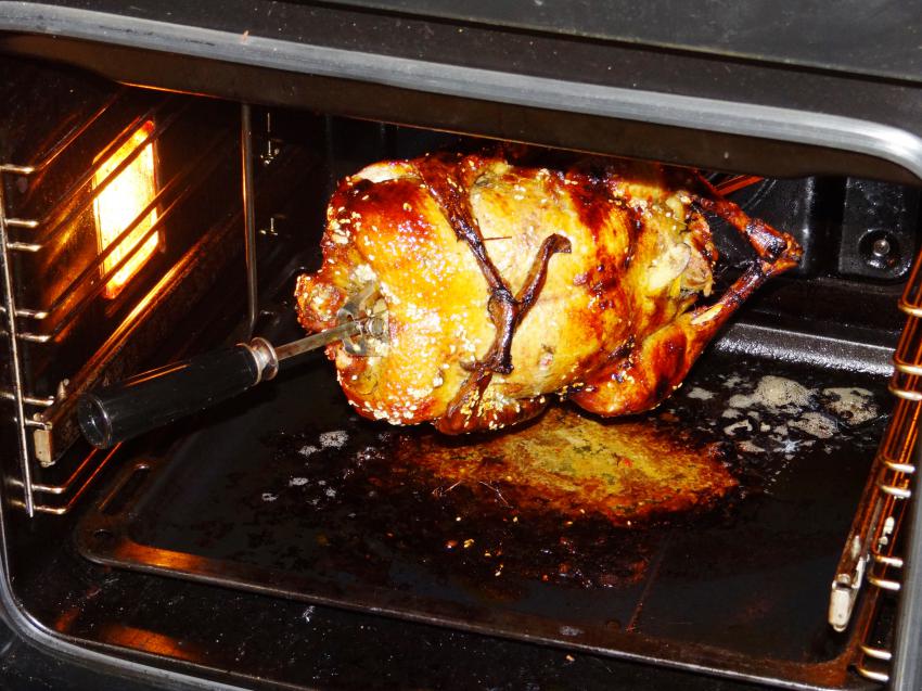 Два часа в духовке, чередуя вертел и турбо гриль.