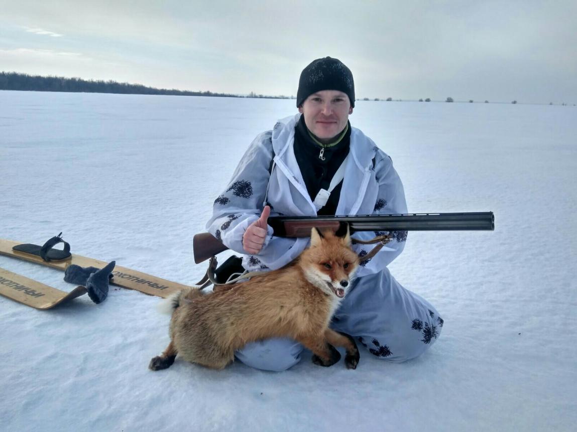По тихому, Женек выбирает место с наиболее вероятным выходом с поля на посадку лисицы. Я также затихарился в кустах. Долгие минуты ожидания. Есть зона поражения, Евгений отдуплетился. Вторая лиса у нас!