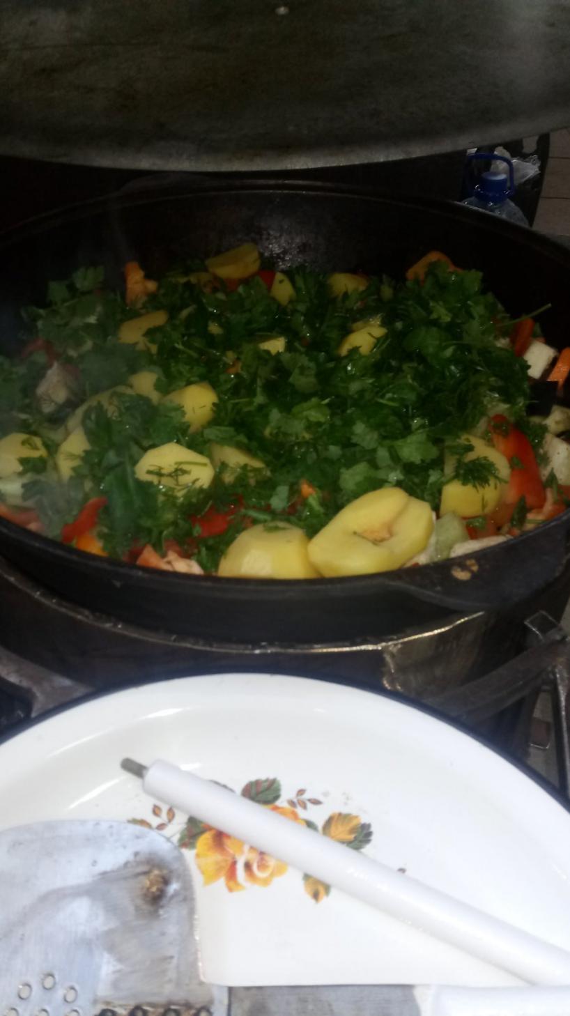 Нус, с Праздником! Блины были на завтрак. Харош. Пооода шепчет. Тандыр во двор и погнали. Для начала уха. В Афганском казане. Картошка, лук, морковь, рыба, специи , соль и заливаем водой. Водрузил на тандыр. Чего за зря воздух греть. Пол часа. Клапана спускаем. И за стол. Тем временем курицу по полам. Блин крупновато. Еще раз по полам. Специи, соль, масло и соевый соус. Мариновалась три часа. На решетку и в тандыр. На дно сковородку и картошку дольками. Иначе жир с куры течет на угли. Подгорает. Мясо пропитывает. Не айс привкус. 40 минут и на стол. Зачетно получилось гости рады.