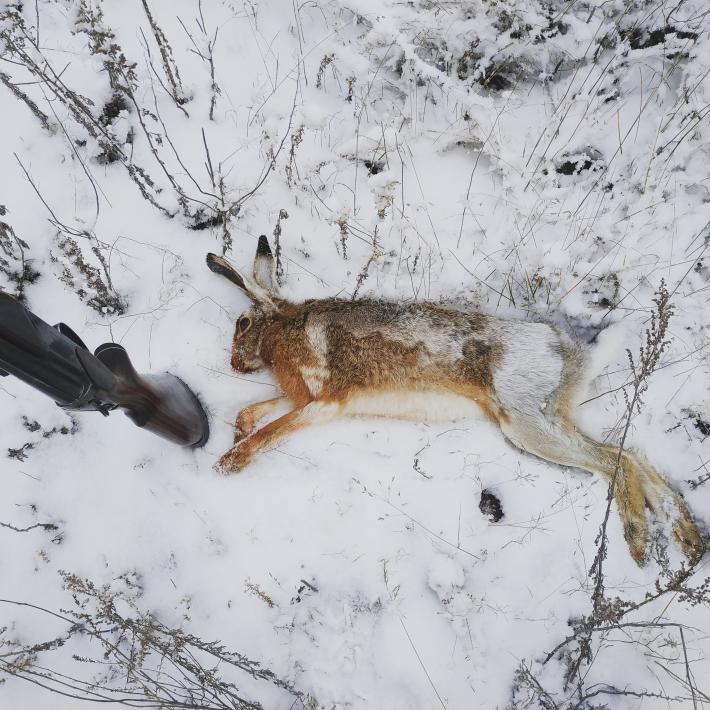Отохотил два дня подряд после снегопада. Вчера облазил почти весь охотучасток - следов нет. И только собрался домой как перед выездом на трассу увидел долгожданные следочки. Видать гулял заяц рано с вечера, следы были припорошены слегка. Пошёл тропить по полю убранного сена. Минут через 15-20 пришёл я к придорожным кустам где налажал по полной программе. К подъёму был готов на 100 процентов. Заяц поднялся в 3 метрах справа и побежал от меня забирая в лево( выставляя тем самым бочину).А я начинаю прицельно херачить метров с 15 и по нарастающей. И вижу всё отлично и упреждение беру и так и сяк и 5 выстрелов мимо. Позор . Полное фиаско. Немогу до сих пор понять как такое случилось. Дома дважды пришлось кальвадоса употребить что бы отлегло. Выкрутил получёк и заменил на цылиндр с напором. Думаю ну завтра вы заячье племя мне за такое унижение ответите. Примчался сегодня с рассветом. Следов полным полно . Мороз -20. Снег хрустит предательски. Пошёл тропить по культивированной пшенице. Крутил он меня крутил и я в итоге потерял след. Но межды полями была разделительная полоса из травы шириной 5 метров. Думаю- Ты морда там должен залечь. Пошёл по середине этой полосы. Подъём все равно был неожиданным. Метров 5 передо мной. Успеваю выстрелить дважды в скрывающуюся уже в траве короткохвостую задницу. Думал что промазал. Побежал за зайцем не видя его и пробежал мимо уже бездыханного тела. Метров через 30 останавливаюсь и думаю -А что это заяц не выбегает в поле. Постоял и пошёл назад к месту куда стрелял. И обалдел - Вот он же заяц лежит и не шевелится. Получилось что я через него просто перепрыгнул когда бежал. Да и умер зайка мгновенно видимо - 6 дробин №2 по грудной клетке. Хорошо филейная часть не пострадала. Прилив радости неописать. Домой шкурить и рюмочку своей чачи за первого зайца в сезоне.