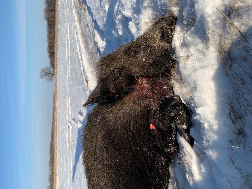 Загонная охота началась в 10 утра. Стандартно провели инструктаж, расселись по машинам и вперед… Выставили номера, в овраг зашли загонщики и 4 собаки - лайки. Загон обещал быть очень интересным, т.к. утренний объезд егерями выявил заходные следы нескольких кабанов разного калибра именно в овраг, косульих следов – тьма. На улице мороз -15 и ветер, чуть с ног не сшибает… Холод ужасный! Собаки «заработали» практически сразу, но было ясно, что кабаны их водят кругами, а значит нужно загонщикам спускаться в дебри, вниз оврага, что б «толкнуть» зверя на номера. Конечно в эти минуты вслушиваешься в любой звук, но ветер… А уж когда собака с лаем поворачивает примерно в твою сторону, замирает сердце... Сеголеток косули выскочил от меня в 30 метрах и я его увидел только через 10-15 секунд (как раз напротив меня заработала лайка по кабанам). По рации услышал голос друга: «от тебя справа уходит косуля». Разворот, быстрый выстрел уже метрах на 80 – промах! Косуля повернулась ко мне белым пятнышком и живая и не вредимая унеслась в соседний лес. Досадно, очень… И не увидел и промазал и кабанов отшугнул от своего номера … слышно, что лай сместился дальше по номерам. «Не промахивается тот, кто не стреляет». Стой теперь и жди. Прошло больше часа и через номер раздались выстрелы… Кабаны! Чуть дальше еще и еще, и еще… Стрелявшим ребятам повезло еще меньше чем мне… Одномоментно выбежало 12 кабанов между номерами, из которых кое как удалось добыть сеголетка кабана и взрослого секача. И так бывает. Итог охоты – 2 кабана и куча промазанных трофеев… Пока разделка, пока собрались – пора пришла ехать на базу. Ну хоть сфоткаться, участвовал же…
