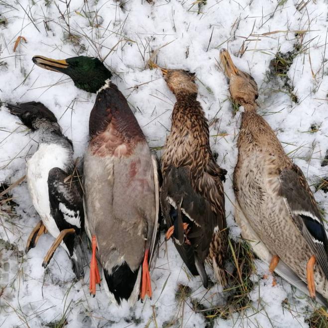 Закрылись по перу. Выехали в пятницу. Снег лупил всю дорогу. С утра в субботу выставили чучела. Утка до обеда моталась. На манок и чучела шла отлично. Взяли трех крякашей и чернеть. И на этом все. Ни на вчерке в субботу, ни утром в воскресенье утки не летали.