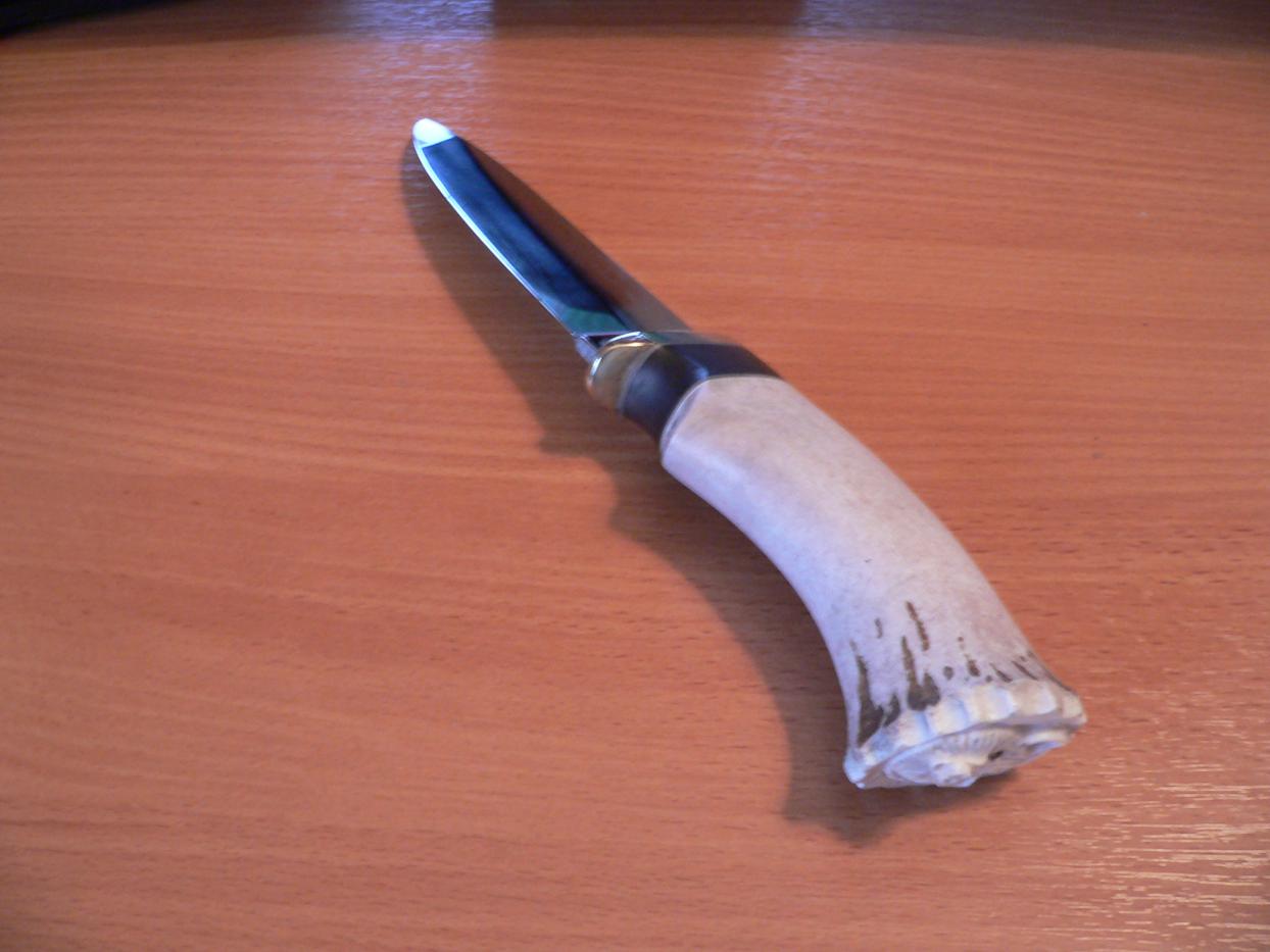 Подходит к завершению моё творение. Клинок из кованной стали тепловозного клапана. На плоскости клинка оставил небольшие следы ковки. Длинна клинка 120 мм., ширина 37 мм., толщина 4 мм. Геометрия клинка - шкуросъёмник. Больстер латунь, рукоять: проставка - африканское чёрное дерево, рог лося. На тыльнике резьба по кости: профиль головы кабана. Планирую на рукояти сделать скримшоу охотничьих миниатюр. Жду в свою сторону тапки, начинайте...