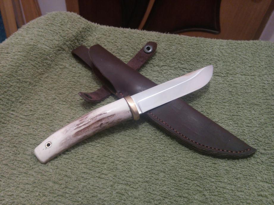 Поковка с ТО от мастера Кузнец Стрелец (ганза). Сталь ХВ5 (алмазка). Твёрдость 61-64 ед. 1. Клинок: Длина 130 мм, ширина 25 мм, толщина обуха 3 мм. Работа по клинку на гриндере от Рустама (ганза). Полировка ручная — продольный сатин до 2000. Заточка ручная на двухстороннем алмазном бруске (1/0 — 0/0,5). 2. Больстер: Латунь толщина 8 мм. Орнамент со стороны клинка — битый камень. 3. Рукоять: Рог лося длина 105 мм. Монтаж всадной на клей «Поксипол». Полировка пастой «Dialux». 4. Ножны: Чепрак шорный комбинированного дубления 3,5 мм. от Мони (ганза). Пропитка масло (сделано на основе костного масла) для кожи. Нить плетеная вощеная (Италия) 1,2 мм. Проклеены и прошиты вручную. Последний раз редактировалось Хитрый Бобер; 18.12.2017 в 18:32. |