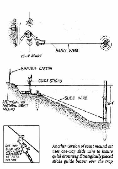 Надо свежих веточек хороший пучек,примерно метр длиной .в воду один конец в близи кормежки,и капкан туда.еще можно плотину чуть чуть разобрать так чтоб шум появился от воды не привычный бобру.Онее 100 %пойдет смотреть.