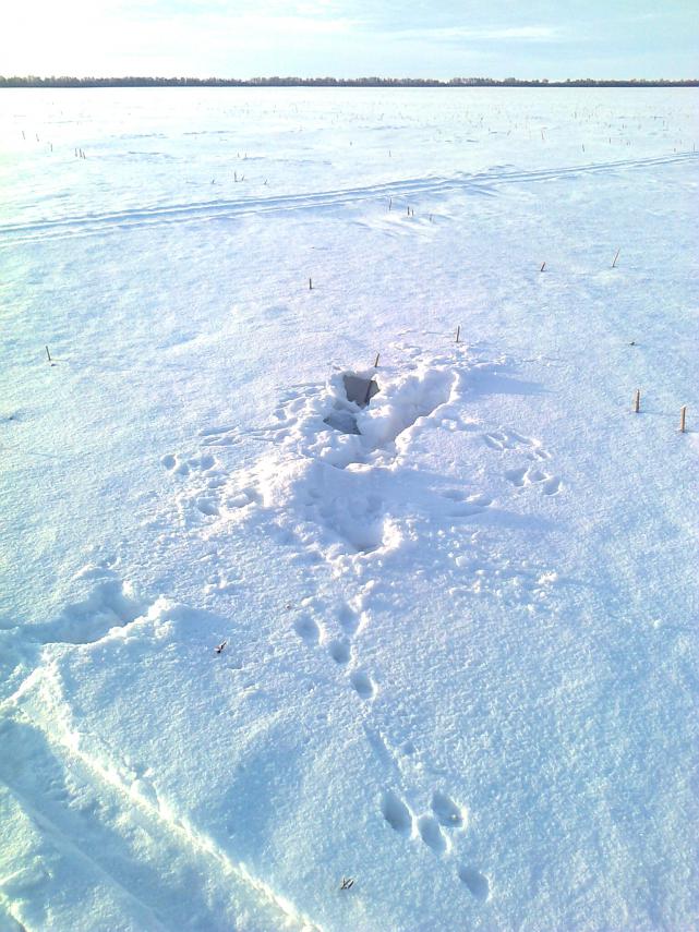 Вчера в сильный ветер повезло выйти на местами занесенный, неприметный, но всё же свежий след, который и привел в итоге на лежку посреди поля.