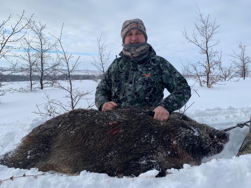 Ребята в соседнюю область пригласили на волка и лисицу... На тропках постояли в овражке… Где то стрельба вдруг, стою , жду… А снега навалило - по пояс проваливаешься… Но эту команду кабанов мы стерегли давно, только из оврага не выходили они днём. А тут и погода и стрельба на той стороне оврага сыграли за нас… кабаны выскочили на тропы и разделившись стали уходить в разные стороны. Смотрю бежит главная мамка, за ней по видимому нянька…. Сеголетков всех волки приговорили… но вдруг третьим выскакивает кабан сначала показавшийся небольшим секачиком… Пуля Л2, вторым Картечь 8,5. Выстрел и над кабаном брызнул фонтан снега - мимо … Второй выстрел - кувырок. Кабан добыт… |