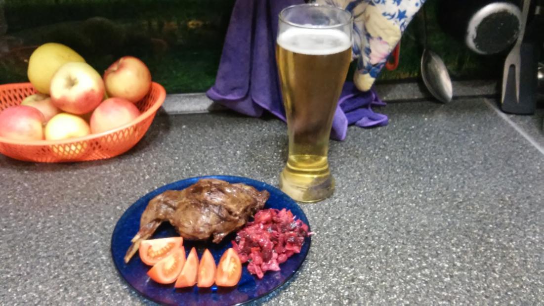 Вчера испортили настроение на работе. Пару кусков косулятины (задок) замороженные на ночь в воду. Утром обработал. Мясо обвалял в смеси: прованские травы+ложка горчицы+ложка майонез на перепелиных яйцах. На день в холодильник. Вечером в разогретую духовку на 1.5 ч. Итог на столе. Домашние "разминаются" сухим красным 2012 г под мясо, я аблизываюсь.... Утром на охоту.