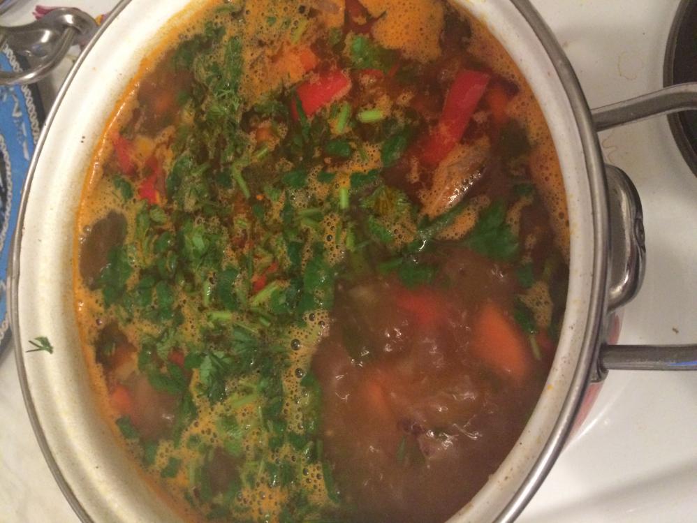 Ну собственно сама Шурпа! Готовил по старому рецепту (много их на просторах да и в книжках). Примерно так: Разморозил мясо косули и на ночь отмокать. Достал мясо, осушил полотенцем и на сковороду (без масла) обжарил в течении минут 7-10 до корочки характерной))). Картошка, морковка, лук шинкуется крупно, болгарский перец обычно. Обжаренное мясо залил холодной водой, добавил целую луковицу и морковку (до раскрытия луковицы, потом ее и морковь выкинул), через 30-40 минут варения мяса добавил свеженарезанные овощи. Поварил еще 20 минут на медленном газу. Позже зелень и соус!!! Соус - помидор мелко нашинкованный и две столовых ложки пасты томатной обжарил на сливочном масле с чесноком. Зелень - укроп, петрушка и кинза. К столу подаю со свежей нарезанной той же зеленью. Приятного аппетита!