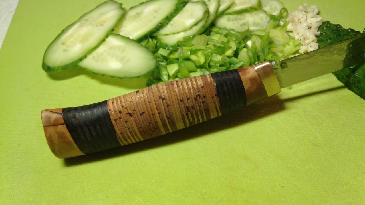 ,задумки были другие,но опыта не хватило и спешка подвела. Спуски на клинке сделал мой друг,остальное сам "намастерил" . С заточкой вообще проблемы...но режет и не плохо! Хотел рукоять полностью с бересты,но половину нарезанных пластин от браковал,при стяжке села и пришлось кожи добавить! Ну как то так получилось,критикуйте!!!