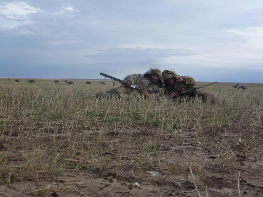 Утро отправляемся на озеро Жетыкуль, посмотреть в какую сторону вылетает гусь и попытаться взять его на выходе, в итоге один не найденный подранок остается в степи после выстрелов моего брата и все. Едем искать присаду гусей, основной гусь летит на просяные поля куда на как всегда нельзя, пытаемся найти на жнивье, и находим не большую стайку которая уже уходит с этого поля на воду, и мы в надежде возвращения гусей роем два окопа и садимся в них в троем, в итоге пока копали гусь уже потихоньку начал возвращаться и одна стайка несколько раз пыталась к нам подлететь, но не дойдя метров 150 отворачивала. Итог первого дня охоты 0, но зато насмотрелись.