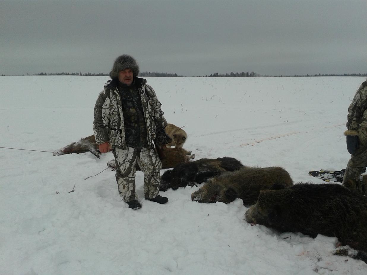 В праздники вырвались на охоту в Кировскую область, как всегда в хорошей компании не надо ничего объяснять и говорить что кому делать все ка-то машинально и непринужденно! Вечером добродушно встретили Кировские егеря и мы улеглись спать ,а утром уже мчались на снегоходах к заветным лесам и пролескам. Поиск зверя был не долгим пока мужики обрезали квартала мы даже чай не успели допить ,как команда по "машинам" через 5 минут уже все на номерах в ожидании загона.Через 30 минут первый выстрел и пошло поехало.... одного подранка не стали добивать привезли всех собачек чтоб малость потренировались на нём, потом пошли в лес собирать трофеи ,затем фотки раздела и на базу,итог первого дня 5 шт. Один секачок был взят с 270 метровВторй день прмерно в таком же сценарии но присоединилось еще 7 охотников был тяжелый и продолжительный загон потом небольшая война из всех калибров еще 7 трофеев лежит в труднопроходимых логах и двое пленных. пока закончивали дела с этой ватагой мяса собаки выгнали из лога еще одного,ребята пошли к собакам но стрелять через бурелом было сложно и даже с дистанции 20 метров пуля не прошла через чепыгу или ушла куда-то всторону! на след утро доджавшысь результатов анализов тронулись неспешно домой! Всех с Новым годом и Рождеством!!!
