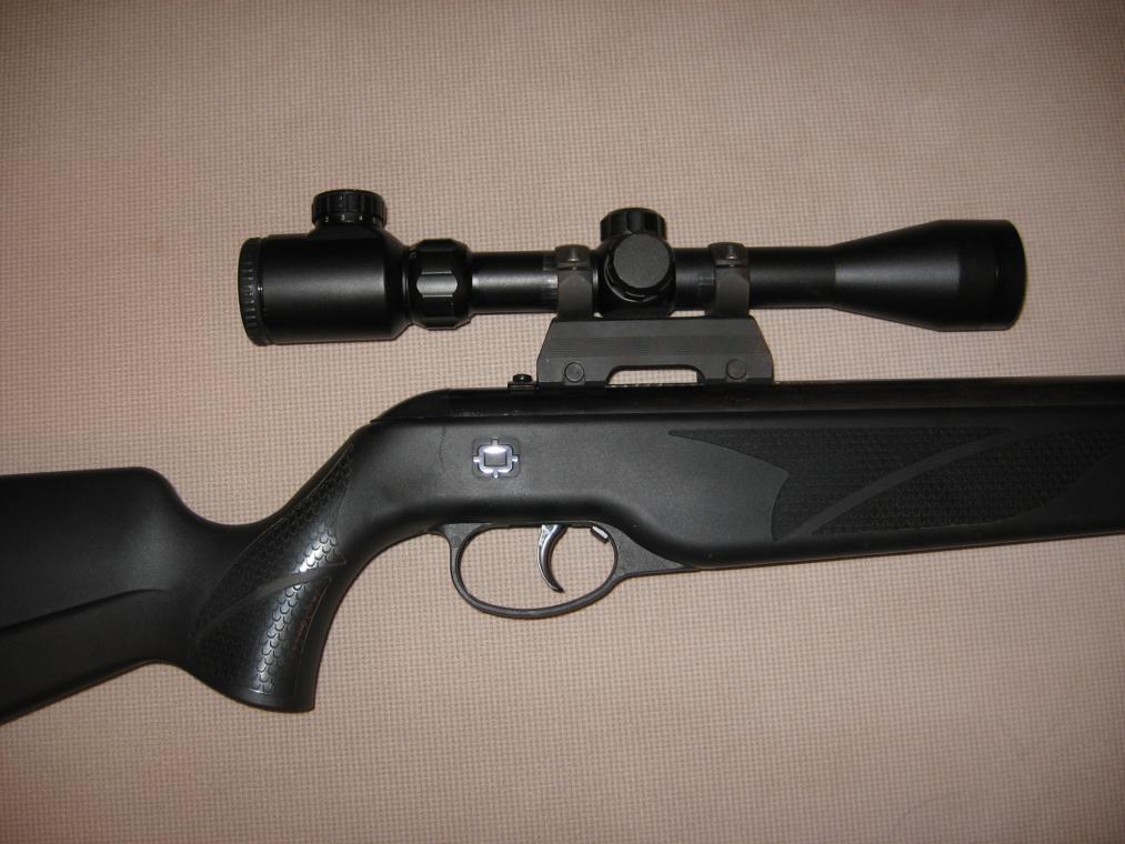 К ней кольца-моноблок и прицел Gamo 3-12x40 с подсветкой.