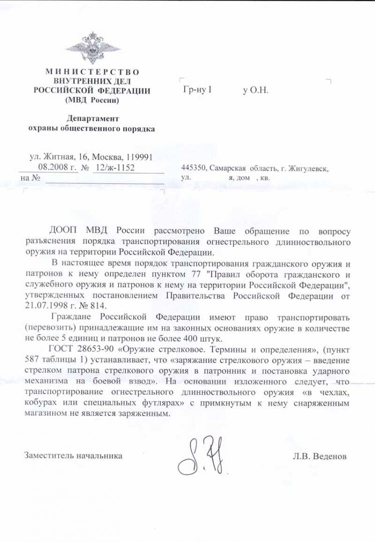 Андрей, так было одно время и письмо из тех времен ( это когда 4 знаменитых постановления правительства вышли. Сейчас: патронник пустой, магазин пустой или отстегнут, ружье в чехле. Два исключения по охоте: переезд на загонной между загонами и охота на волка - лису по сан.отстрелу. Всё. Протокол выписан за дело. Спорить не о чем...
