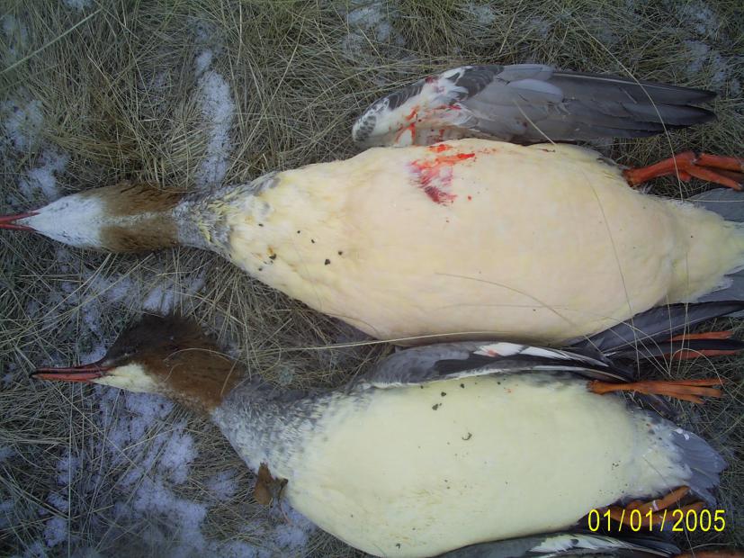 большой крохаль, мы называем "птерадактель", не стреляем как раз по причине малосъедобности, если есть только снимать шкуру и убирать весь жир