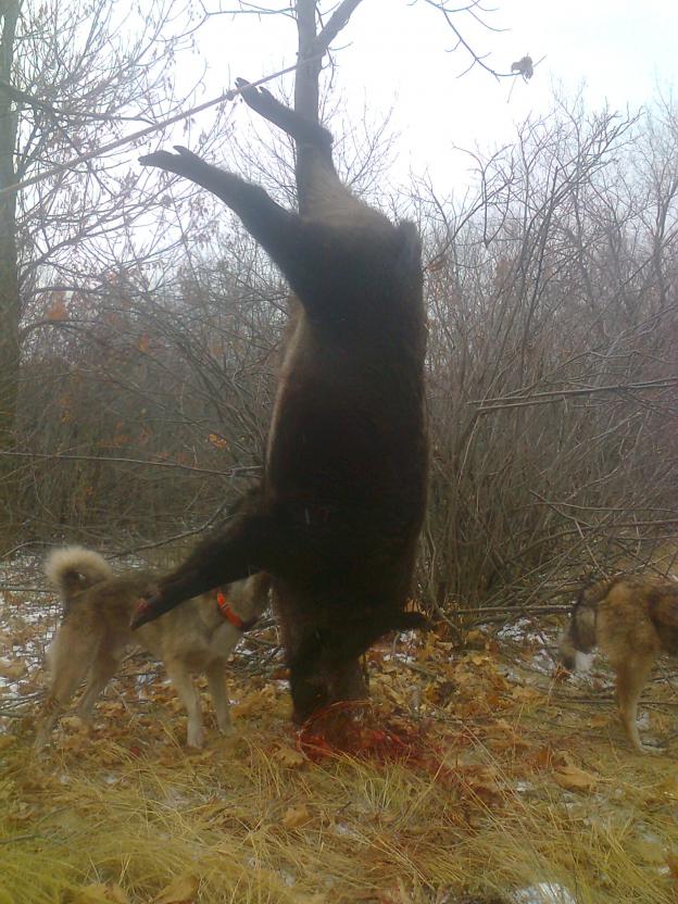Славно поохотились на коллективной охоте в субботу! Добыт трофейный секач!