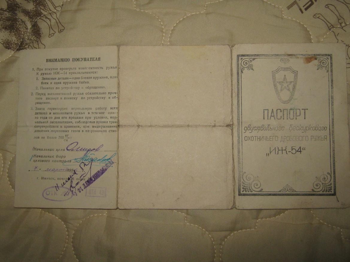 Иж-54. Изготовлено спустя ТРИ года после смерти СТАЛИНА .12/70, стволы около 750 , сужения стандартные, сохранился паспорт. Калка сохранилась на 3+,стволы внутри имеют сыпь (не критично и хватит еще внукам)снаружи в месте удержания рукой имеет потертости, дерево рабочее, кромка затыльника отколота на функциональные качества не влияет, других дефектов явных/скрытых не обнаружено.Общее состояние ружья на 4 балла, учитывая что ружью 7 марта будет 59 лет.