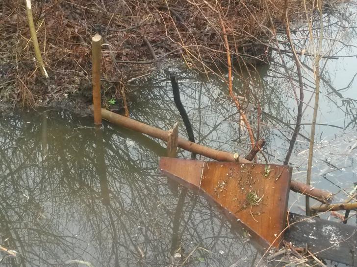 Сегодня доехал, переставил капканы, на одном канале соорудил целую баррикаду))- весь этот хлам был в воде...я только придал форму, думаю не напугает моего зубастого " друга")))