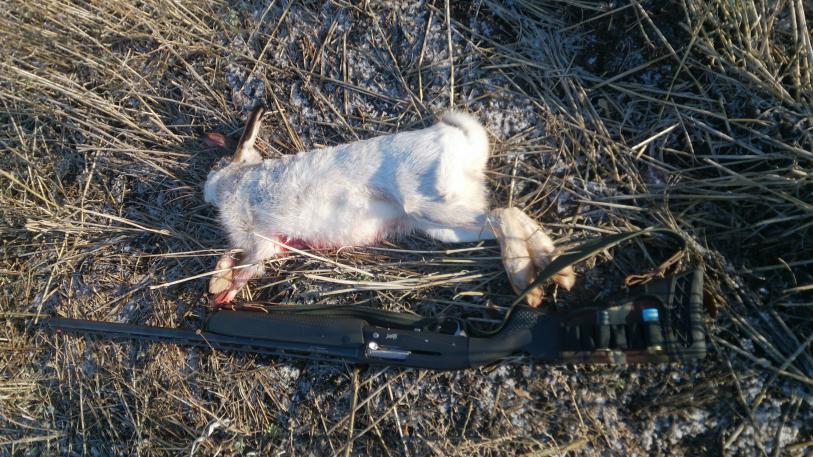 В субботу погуляли с отцом по полям в итоге один подъем и один заяц взят. Заяц первый в карьере охотника! Было очень приятно. Ездили на юг области, снега там нет, получилось как по чернотропу. Считаю нарвались случайно т.к. отец там проходил я проходил, но он не вставал и только после третьего прохода, немного с другой стороны, этого места встал. Подъем был в районе 12 часов. Погуляли хорошо да ещё и с добычей в двойне приятно. Зайца приготовили, попробовали, оказался очень вкусный. Вес зайца без шкуры 4,5 кг.