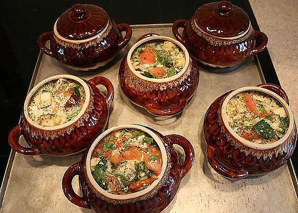 1.ЖАРКОЕ ИЗ КУРИЦЫ ПО-РУССКИ Ингредиенты: Курица весом примерно 1 кг, 400 г репчатого лука, 50 г изюма, 50 г ядер грецкого ореха, 50 г свежих грибов, 15 г сливочного масла, свежая зелень, соль, молотый черный перец. Для соуса: 25 г муки высшего сорта, 400 г сметаны, 25 г сливочного масла. Приготовление: Тушку промыть, обсушить, разрубить на 8 кусков, посолить, поперчить, обжарить до полуготовности. Лук нашинковать полукольцами и обжарить до золотистого цвета. Грибы нарезать соломкой и обжарить. Орехи обжарить, снять с них кожицу и измельчить. Изюм промыть и обсушить. Приготовить сметанный соус: в сотейнике растопить и прогреть масло, всыпать просеянную муку и пассеровать, помешивая, до запаха "жареного ореха". Пассерованную муку постепенно, непрерывно помешивая, развести горячей сметаной. Положить курицу в горшочки (по 2 куска на порцию), туда же изюм, грибы, лук и орехи. Все залить сметанным соусом. Поставить в духовку и тушить 20-25 минут при 180 град. При подаче посыпать рубленой зеленью. 2.ТОМАТНЫЙ СУП, ЗАПЕЧЁННЫЙ В ДУХОВКЕ Ингредиенты на 6 человек: 1 кг помидоров, 800 гр бульона, 3 средних луковицы, тертый пармезан - 150 гр, белый хлеб (только не батон, а грубый такой , круглый), чеснок, оливковое масло, соль, перец. Приготовление: Мелко порезать лук с 3 дольками чеснока, обжарить на оливковом масле, добавить порезанные помидоры, обжарить вместе с луком и добавить бульон и три куска хлеба (больших куска!), порезанного кубиками без корки, немного соли и молотый перец. Накрыть крышкой и оставить на медленном огне примерно на 40 минут. Взять огнеупорные кастрюльки (или горшочки), разлить суп по горшочкам, в каждый горшочек положить по ломоть хлеба, натертого чесноком, посыпать сыром, сбрызнуть маслом и запечь в духовке. 3. ЦЫПЛЯТА В ГОРШОЧКЕ Ингредиенты: 1 цыпленок (200 г), 140 г картофеля, 50 г репчатого лука, 25 г моркови, 10 г кулинарного жира, 5 г сушеных белых грибов, соль, 10 г сыра, зелень петрушки. Для соуса: 75 г сметаны, 10 г муки, 75 г грибного отвара, соль. Приготовление: Обработанного цыпленка разрубить на куски массой 40-50 г. Сырые картофель, морковь, лук порезать кубиками. Лук и морковь спассеровать отдельно друг от друга. Подготовленные грибы отварить, нарезать соломкой. Куски цыплят положить в горшочек, добавить сырой картофель, пассерованные лук и морковь, грибы, залить сметанным соусом и тушить в духовке 30-40 минут. За 10-15 минут до окончания тушения посыпать тертым сыром. Для соуса муку спассеровать без жира, слегка охладить, влить горячий грибной бульон, вымешать до однородной массы, варить 20 минут. В конце варки добавить прокипяченную сметану, соль, варить еще 5 минут, процедить. Подать, посыпав зеленью петрушки. 4. ГРЕЧКА С МЯСОМ В ГОРШОЧКЕ Ингредиенты на 3 горшочка: 500 гр свинины, 9 ст л гречневой крупы, 2 бульонных кубика 2 репчатые луковицы, 1 лавровый лист Приготовление: Мясо (лучше свинину) порезать на кусочки, мелко порезать лук, разложить в горшочки. В каждый горшок насыпать по 3 столовые ложки промытой крупы (гречневой или пшена или и того и и другого), добавить раскрошенный лавровый лист. Залить содержимое горшков бульоном из кубиков (лучше куриным или грибным). Поставить в духовку на час при средней температуре. 5. РУССКОЕ ЖАРКОЕ С МЯСОМ Ингредиенты на 4 порции: 650 гр говядины, 1,5 кг картофеля, 4 ст л сливочного масла, 2 головки репчатого лука, 3/4 ст мясного бульона, 1 ст сметаны, лав