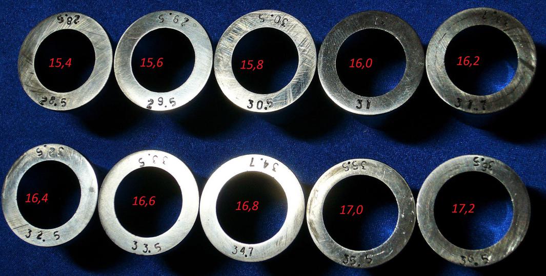 Это зависит от дробовых снарядных навесок, которые будут применятся при стрельбе... Но, исходя из своего опыта, изготовил бы бушинги с внутренним диаметром, которые выставил тебе на обозрение.)) Поясню, к примеру: Дробовые снаряды при сборке патронов, будут производится и на различных номерах дроби... И если мерная втулка (бущинг) на дроби №5 будет показывать вес 32гр, то уже на №7, эта же втулка будет показывать 32,7гр, а на №3 31,4гр... Поэтому, на моих мерных втулках и имеется шаг в диаметре 0,2мм, для того, что бы можно было за счет +0,2мм, или -0,2мм на бушингах, подобрать объем дробового снаряда, в весе 32гр, на любых номерах дроби...