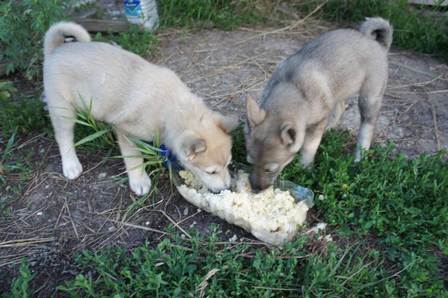 Едим сами, щенки очень активные... рычат, друг друга покусывают и лают...